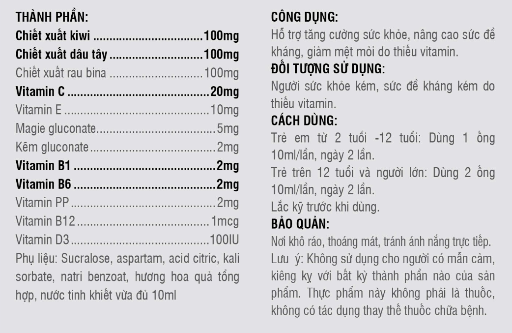 Hỗ trợ tăng cường sức khỏe, nâng cao sức đề kháng, giảm mệt mỏi do thiếu vitamin.